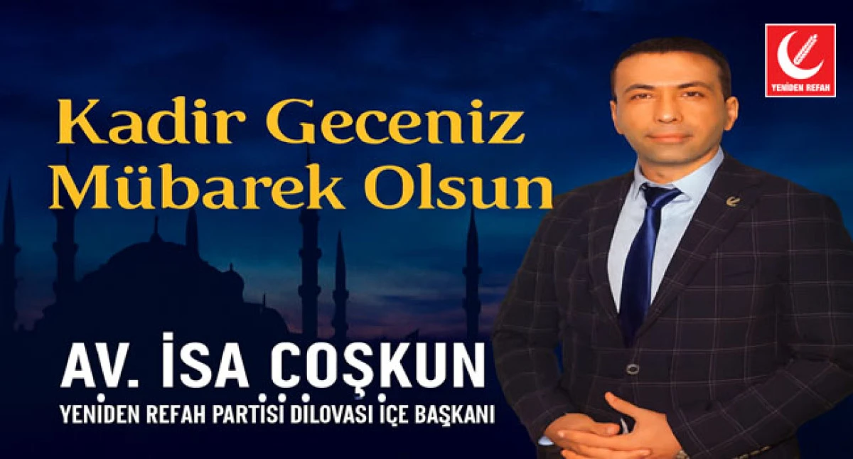 Yeniden Refah Partisi Dilovası İlçe Başkanı Av. İsa Coşkun, Kadir Gecesi dolayısıyla yayımladığı mesajında şu ifadeleri kullandı: Bin aydan daha hayırlı olan Kadir Gecesi’ne erişmenin huzurunu yaşıyoruz. Bu mübarek gece, duaların kabul olduğu, gönüllerin arındığı ve kardeşliğin pekiştiği bir rahmet vesilesidir.