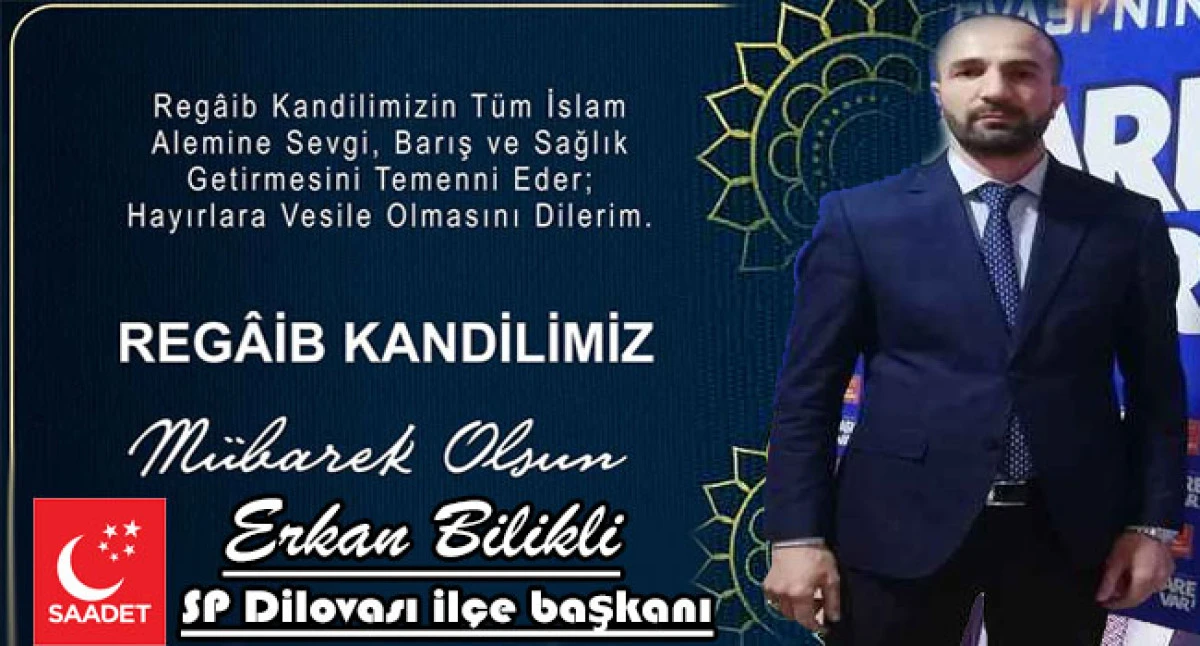 Saadet Partisi Dilovası ilçe başkanı Erkan Bilikli Regaip Kandili dolayısıyla yayınladığı mesajda bütün Müslüman aleminin Regaip Kandili’ni kutladı.