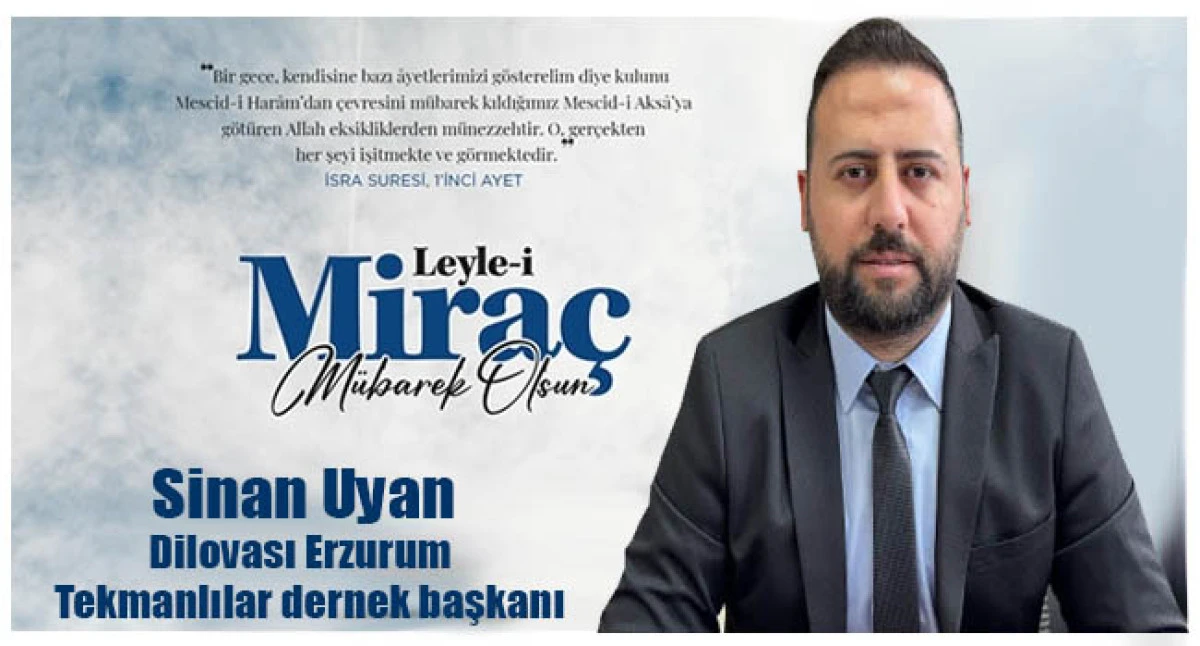 Dilovası Erzurum Tekmanlılar Derneği Başkanı Sinan Uyan. Miraç Kandili dolayısıyla bir mesaj yayımlayarak İslam dünyasının bu özel gecesini kutladı. Başkan Sinan Uyan, mesajında Miraç Kandili’nin önemi ve insanlığa verdiği ilahi mesajlara dikkat çekti.