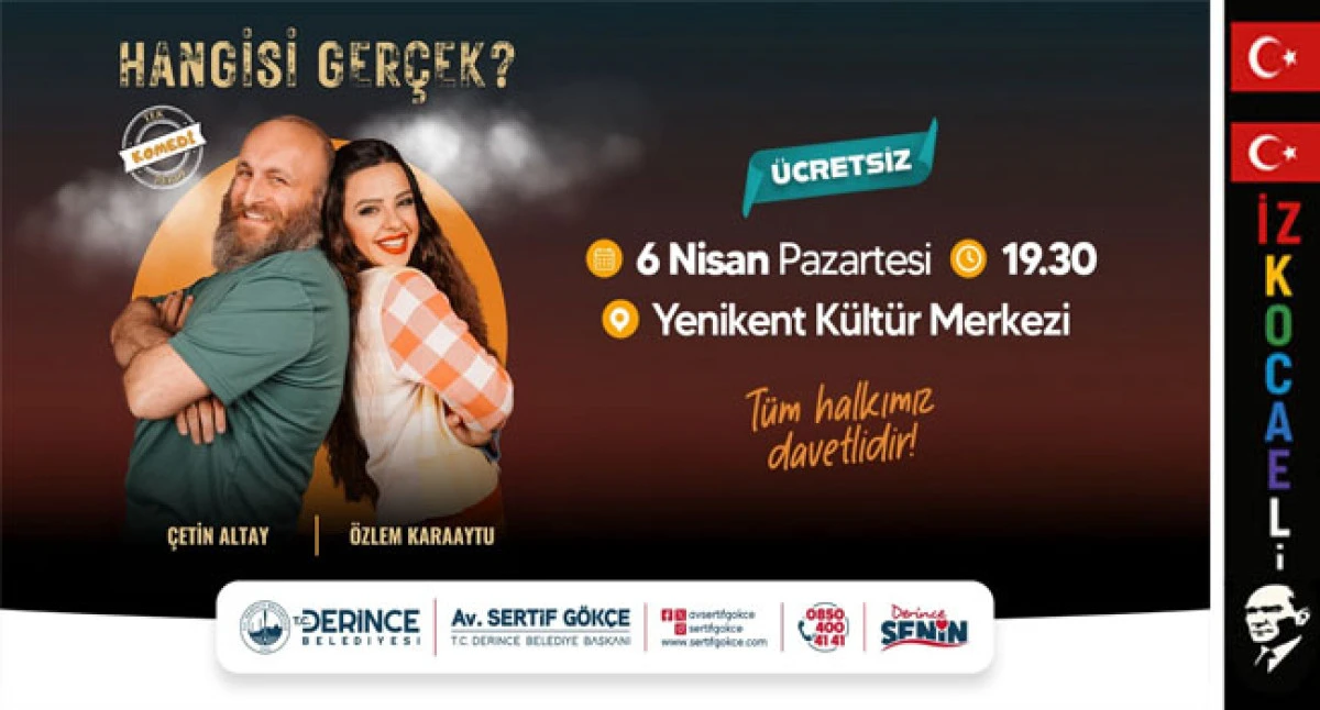 Kültürel ve sanatsal etkinlikler kapsamında çalışmalarını sürdüren Derince Belediyesi, yeni bir programı daha ilçe halkıyla buluşturuyor. Ekranların sevilen isimleri Çetin Altay ve Özlem Karaaytu’nun sahne alacağı “Hangisi Gerçek” adlı tiyatro oyunu, komedinin en güzel örneklerini sahneye taşıyacak.